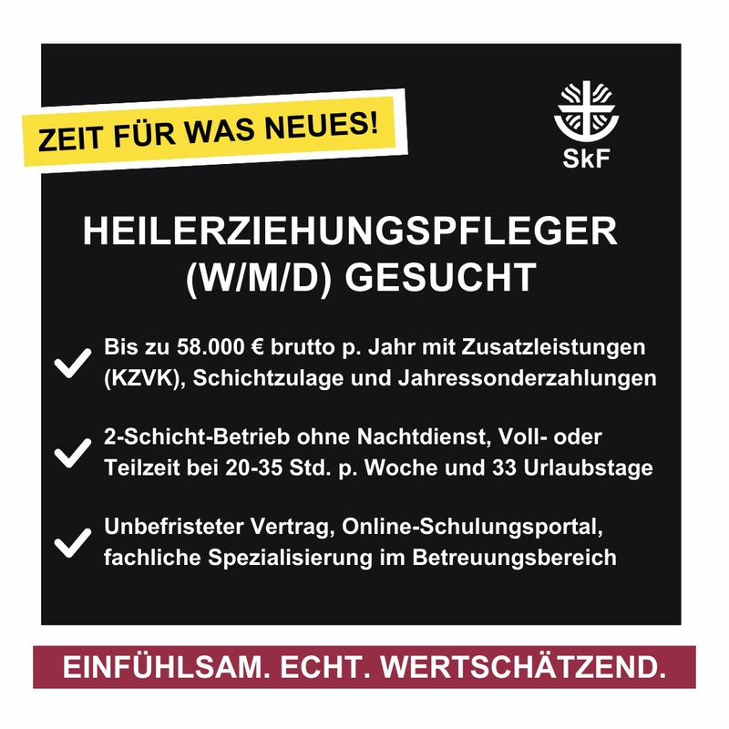 Du suchst nach einer sinnstiftenden Tätigkeit in deinem Arbeitsalltag? Dann werde jetzt Teil des Teams beim SkF in Berlin-Pankow - mit und ohne Konfession. Du unterstützt die Assistenznehmer/innen in ihrem Alltag und bist Ansprechperson in allen Lebenslagen. Freue dich auf kleine Betreuungseinheiten und lasse deine Hobbies und Ideen in die Freizeitgestaltung mit einfließen. Zusätzlich profitierst du neben attraktiven Rahmenbedingungen von zahlreichen Fort- und Weiterbildungen.