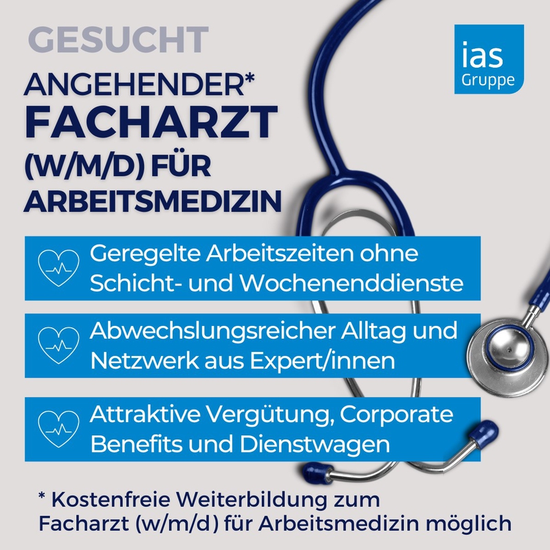 Suchst du nach einer Gelegenheit, die Gesundheit am Arbeitsplatz aktiv mitzugestalten? Als Schlüsselrolle in unserem interdisziplinären Team bist du verantwortlich für die Durchführung von Präventivuntersuchungen und die umfassende Beratung zu arbeitsmedizinischen Themen. Genieße die Vielfalt der Kunden aus unterschiedlichen Branchen und starte direkt von zu Hause aus zu Kundenbesuchen. Erlebe die Arbeit in einem diversen Team, profitiere, falls noch nicht vorhanden, von unserer kompletten Finanzierung deiner Weiterbildung zum Facharzt (w/m/d) für Arbeitsmedizin und erlebe Zeitsouveränität ohne Schicht- und Wochenenddienste. Deine Karriere erwartet dich!
