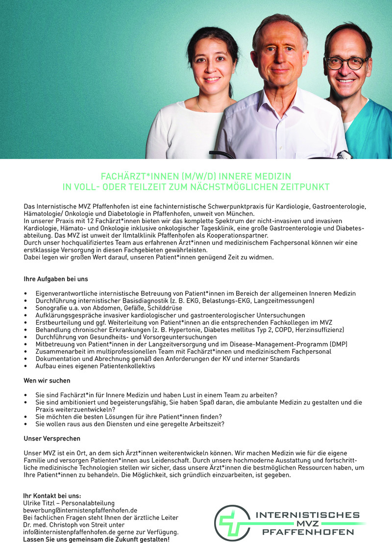 Ihr Kontakt bei uns: Ulrike Titzl – Personalabteilung bewerbung@internistenpfaffenhofen.de Bei fachlichen Fragen steht Ihnen der ärztliche Leiter Dr. med. Christoph von Streit unter info@internistenpfaffenhofen.de gerne zur Verfügung. Lassen Sie uns gemeinsam die Zukunft gestalten! |