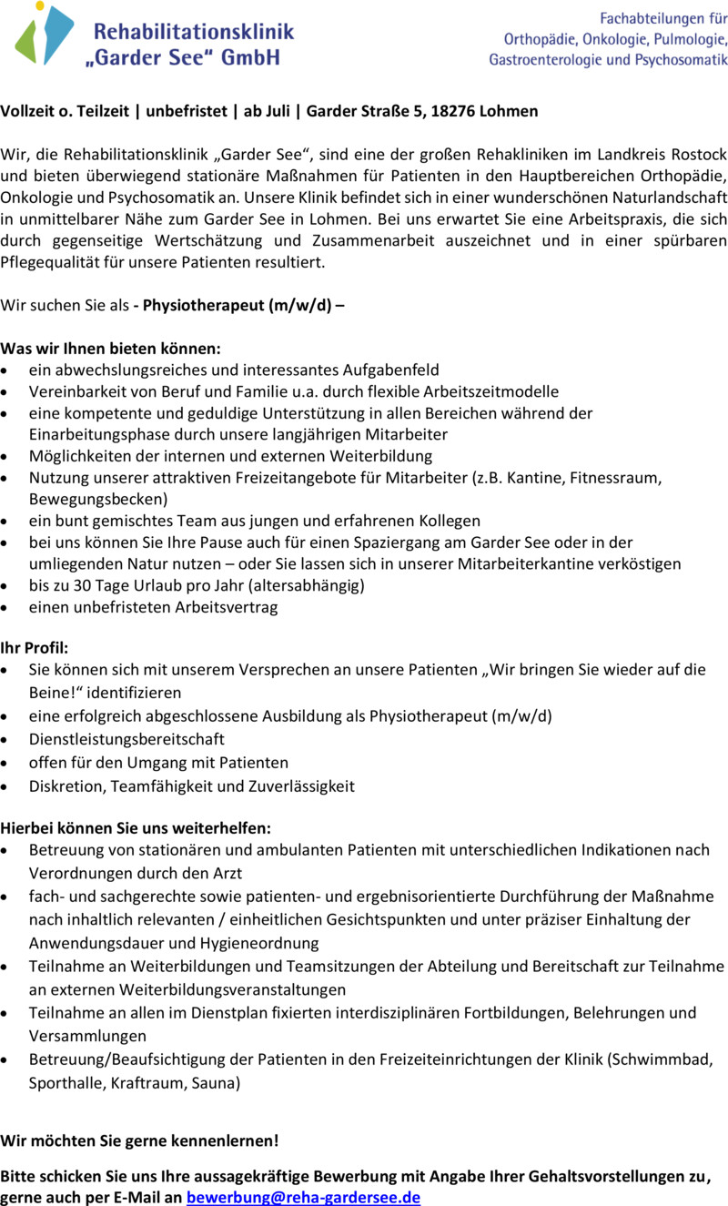 Wir suchen Sie als - Physiotherapeut (m/w/d) –