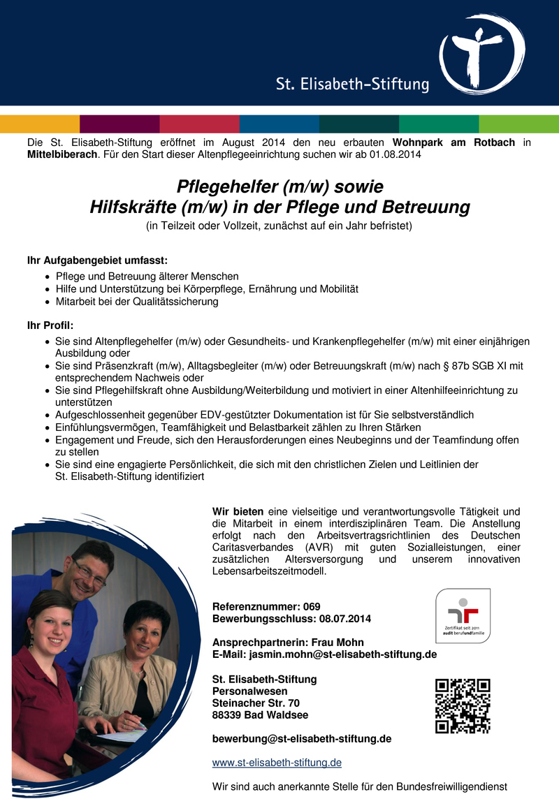 Referenznummer: 069 Bewerbungsschluss: 08.07.2014 Ansprechpartnerin: Frau Mohn E-Mail: jasmin.mohn@st-elisabeth-stiftung.de St. Elisabeth-Stiftung Personalwesen Steinacher Str. 70 88339 Bad Waldsee bewerbung@st-elisabeth-stiftung.de www.st-elisabeth-stiftung.de Wir sind auch anerkannte Stelle für den Bundesfreiwilligendienst |