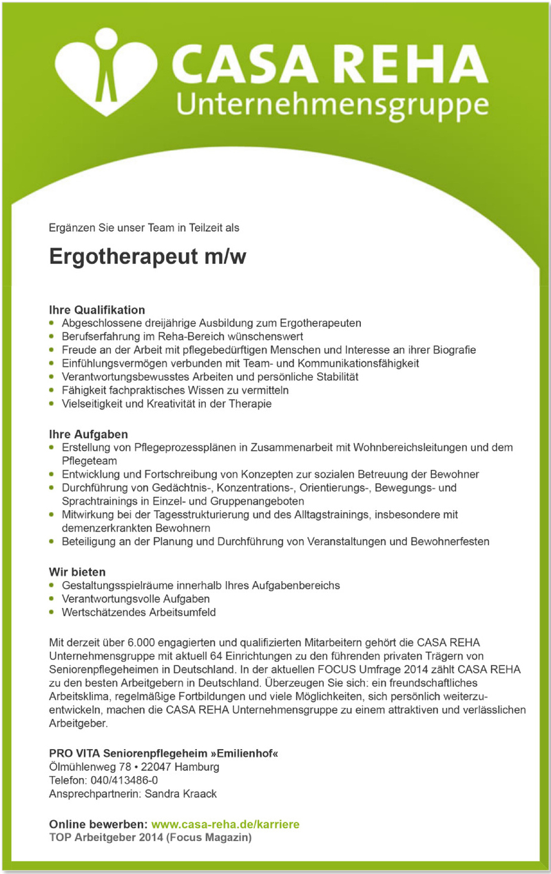 PRO VITA Seniorenpflegeheim »Emilienhof« Ölmühlenweg 78 • 22047 Hamburg Telefon: 040/413486-0 Ansprechpartnerin: Sandra Kraack Online bewerben: www.casa-reha.de/karriere TOP Arbeitgeber 2014 (Focus Magazin) |