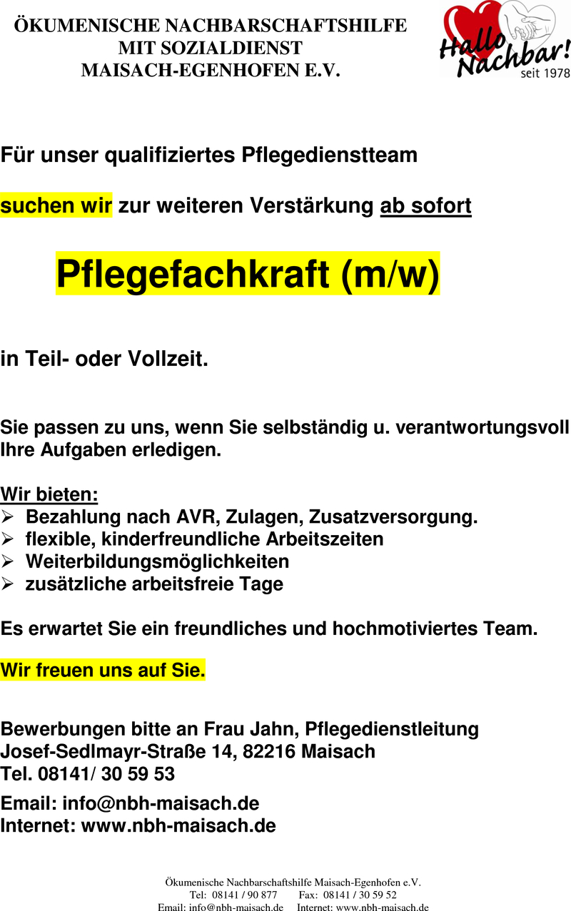 Ökumenische Nachbarschaftshilfe Maisach-Egenhofen e.V. Frau Maria Jahn - Pflegedienstleitung Josef-Sedlmayr-Str. 14 82216 Maisach Tel. 08141-305953 Email: info@nbh-maisach.de Internet: www.nbh-maisach.de |