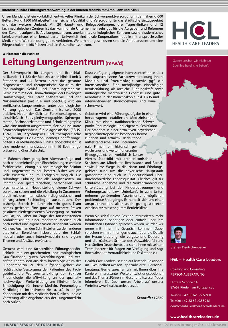 Geboten wird eine Führungsaufgabe in einer hervorragend etablierten Medizinischen Klinik mit einem traditionsreichen Schwerpunkt Pneumologie und eigenem Schlaflabor. Der Standort in einer attraktiven bayerischen Regionalmetropole ist besonders hervorzuheben und attraktiv. Bedeutende mittelständische und internationale Firmen, ein historisch gewachsenes und weiter florierendes Einzugsgebiet, ein vorbildlich konserviertes Stadtbild mit architektonischen Schätzen aus Mittelalter, Renaissance und Barock, sowie kurze Wege in die Natur und Erholungsgebiete rund um die bayerische Hauptstadt garantieren eine auch in Süddeutschland überdurchschnittliche Lebensqualität. Gleiches gilt für schulische Angebote und die Verkehrsanbindung. Unterstützung bei der Kinderbetreuungs- und Wohnungssuche bzw. Unterkunft in zum Unternehmen gehörenden Apartments ermöglichen problemlose Übergänge. Es handelt sich um einen anspruchsvollen aber auch gut gestalteten Arbeitsplatz mit sehr gutem Betriebsklima.