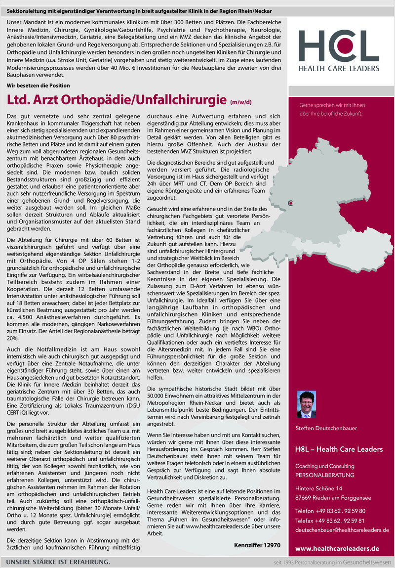 Gesucht wird eine erfahrene und in der Breite des chirurgischen Fachgebiets gut verortete Persönlichkeit, die ein interdisziplinäres Team an fachärztlichen Kollegen in chefärztlicher Vertretung führen und auch für die Zukunft gut aufstellen kann. Hierzu sind unfallchirurgischer Hintergrund und strategischer Weitblick im Bereich der Orthopädie genauso erforderlich, wie Sachverstand in der Breite und tiefe fachliche Kenntnisse in der eigenen Spezialisierung. Die Zulassung zum D-Arzt Verfahren ist ebenso wünschenswert wie Spezialisierungen im Bereich der spez. Unfallchirurgie. Im Idealfall verfügen Sie über eine langjährige Laufbahn in orthopädischen und unfallchirurgischen Kliniken und entsprechende Führungserfahrung. Zudem bringen Sie neben der fachärztlichen Weiterbildung (je nach WBO) Ortho-pädie und Unfallchirurgie nach Möglichkeit weitere Qualifikationen oder auch ein vertieftes Interesse für die Altersmedizin mit. In jedem Fall sind Sie eine Führungspersönlichkeit für die große Sektion und können den derzeitigen Charakter der Abteilung vertreten bzw. weiter entwickeln und spezialisieren helfen.