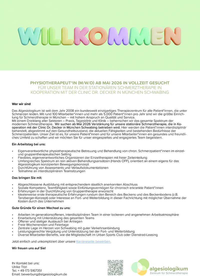 Wir freuen uns auf Sie! Bewerben Sie sich direkt über unsere Karriere Seite: Algesiologikum GmbH Ulrike Titzl Rosenkavalierplatz 10 81925München Tel.: + 49 173 5167351 https://algesiologikum.de/algesiologikum/karriere |