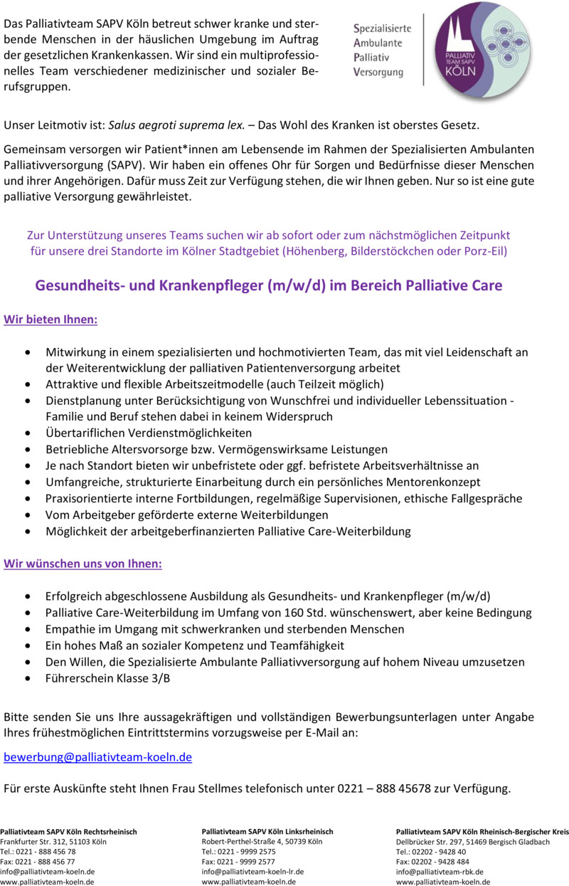 Neugierig geworden? Dann sollten wir uns persönlich kennenlernen! Bitte senden Sie uns Ihre aussagekräftigen und vollständigen Bewerbungsunterlagen vorzugsweise per E-Mail an: bewerbung@palliativteam-koeln.de Für erste Auskünfte steht Ihnen Frau Stellmes unter der Nummer 0221 – 888 45678 gerne zur Verfügung. Wir freuen uns auf die gemeinsame Weiterentwicklung! Mehr Informationen erhalten Sie auch über unsere Webseite auf: www.palliativteam-koeln.de |